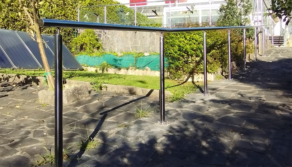 La barandilla está formada por postes verticales y pasamanos, ambos de sección tubular redonda. El acabado elegido es el AISI 316. La mayor calidad y protección posible al ser una barandilla ubicada en exteriores y con cierta cercanía al mar Cantábrico.