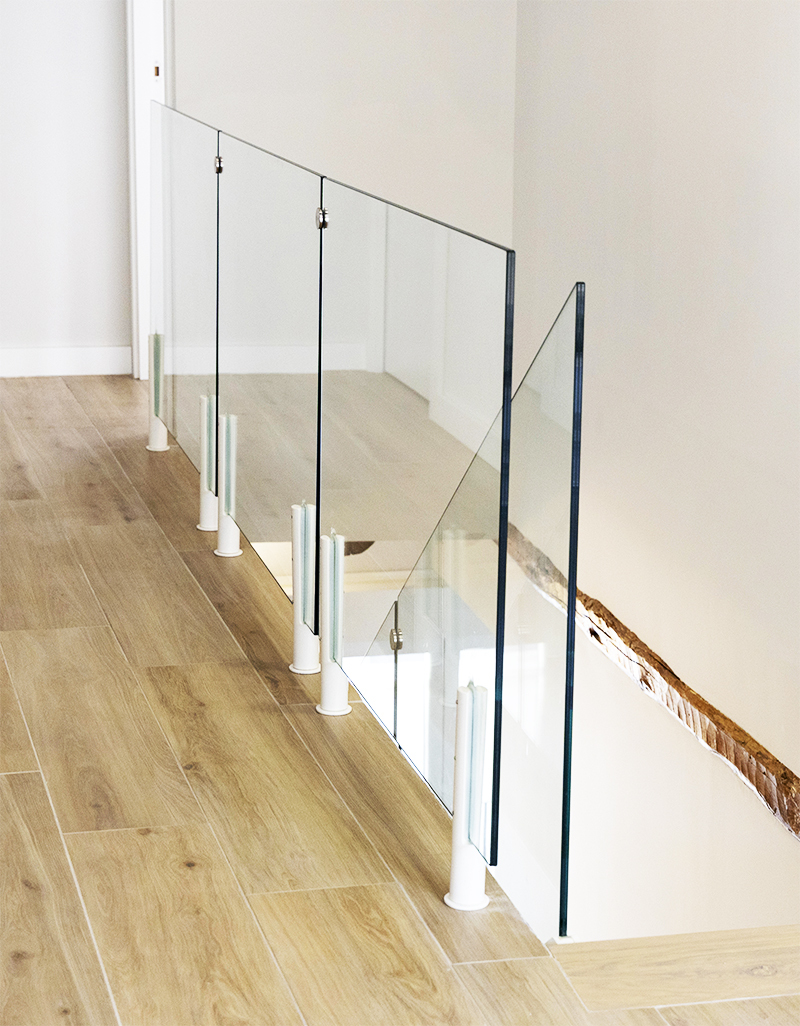 Hemos instalado tres módulos de barandilla de vidrio y seis unidades de soporte, dos por cada barandilla. En un tramo recto. De fácil montaje, nuestro poste permite la colocación de barandillas de vidrio sin necesidad de perforaciones. Queda muy firme al insertarlo por la ranura de cada pieza. Después, unos pasadores ayudan a fijarlo a un más para que el vidrio no vibre ni tenga oscilaciones.