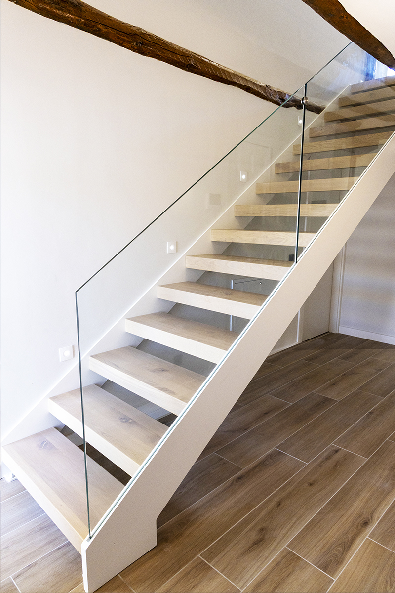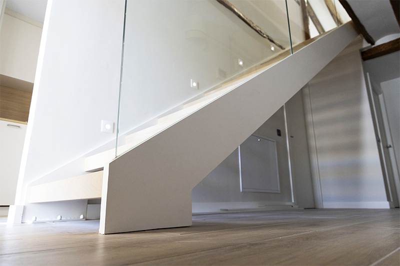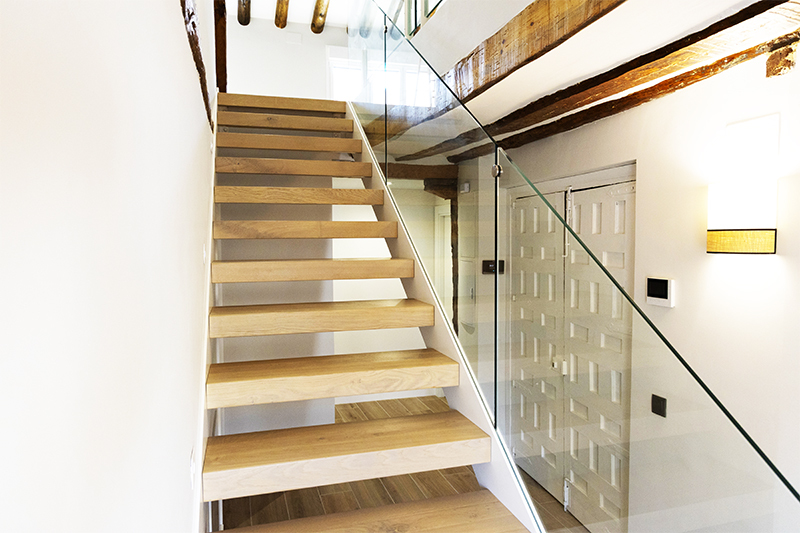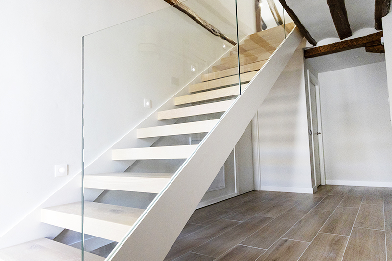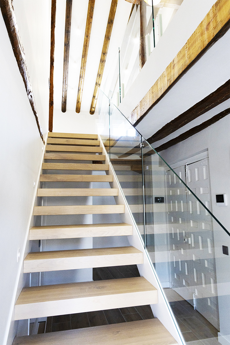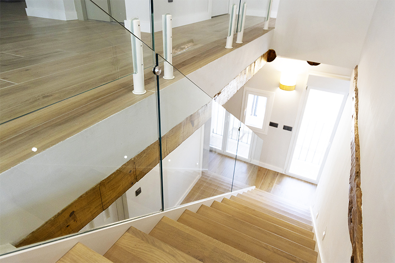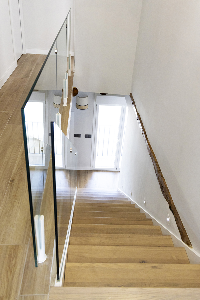 El trabajo se completa con la instalación de una barandilla de vidrio recta en el hueco superior para evitar caídas por la escalera.