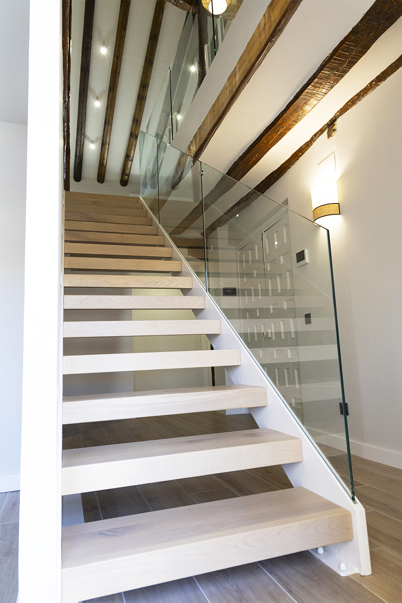 Escalera modelo «Cascante»: zancas laterales con barandilla de vidrio
