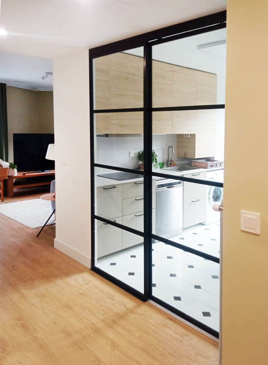 Este tipo de cerramientos son una excelente opción para ganar luminosidad en las estancias interiores de una vivienda. El vidrio incoloro deja pasar la luz proveniente de la ventana de la cocina hasta el pasillo. Además, ofrece unas buenas prestaciones de aislamiento acústico y de olores, impediendo que estos alcancen el pasillo y la sala de estar.
