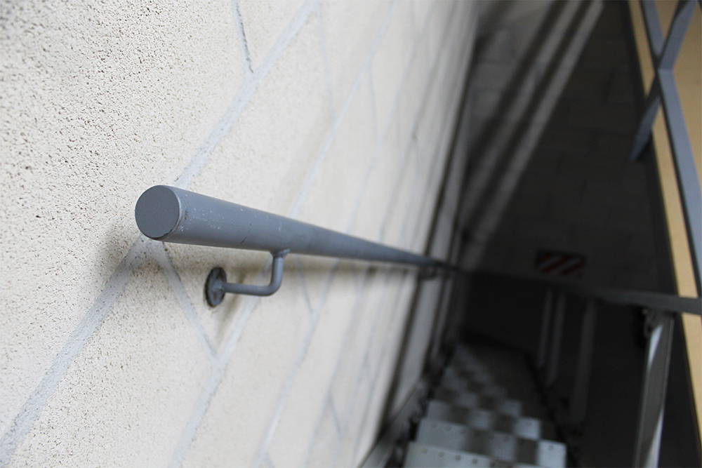 La entreplanta se completa con la instalación de una barandilla de seguridad en el hueco de la planta superior y un pasamanos de sección circular anclado a la pared para una mayor seguridad en el uso de la escalera.