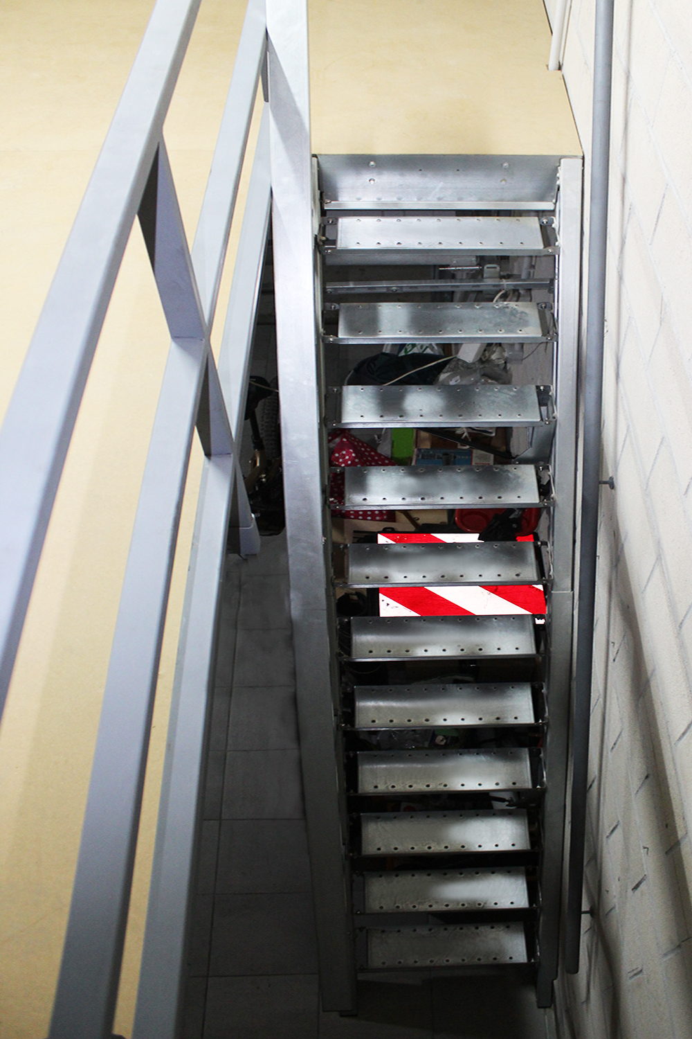 Aquí puedes ver lo poco que ocupa la escalera articulada cuando está replegada en la pared.