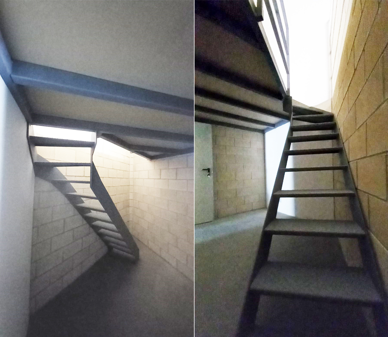 Diseño, fabricación y montaje de entreplanta para trastero de dimensiones reducidas. Esta entreplanta tiene la característica de tener una forma especial, con una esquina cerrada. Nuestro diseñador ubica la escalera en ese lado con el objetivo de optimizar al máximo el espacio disponible sin que el hueco de escalera reste superficie aprovechable.