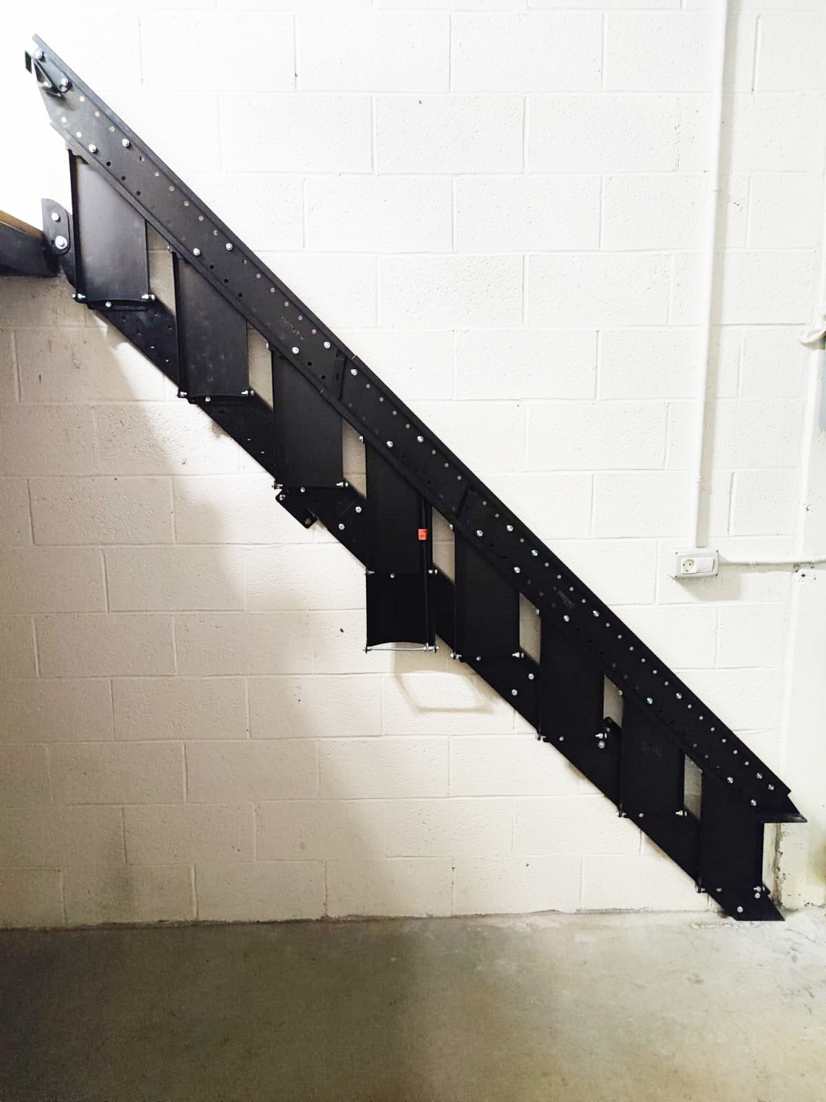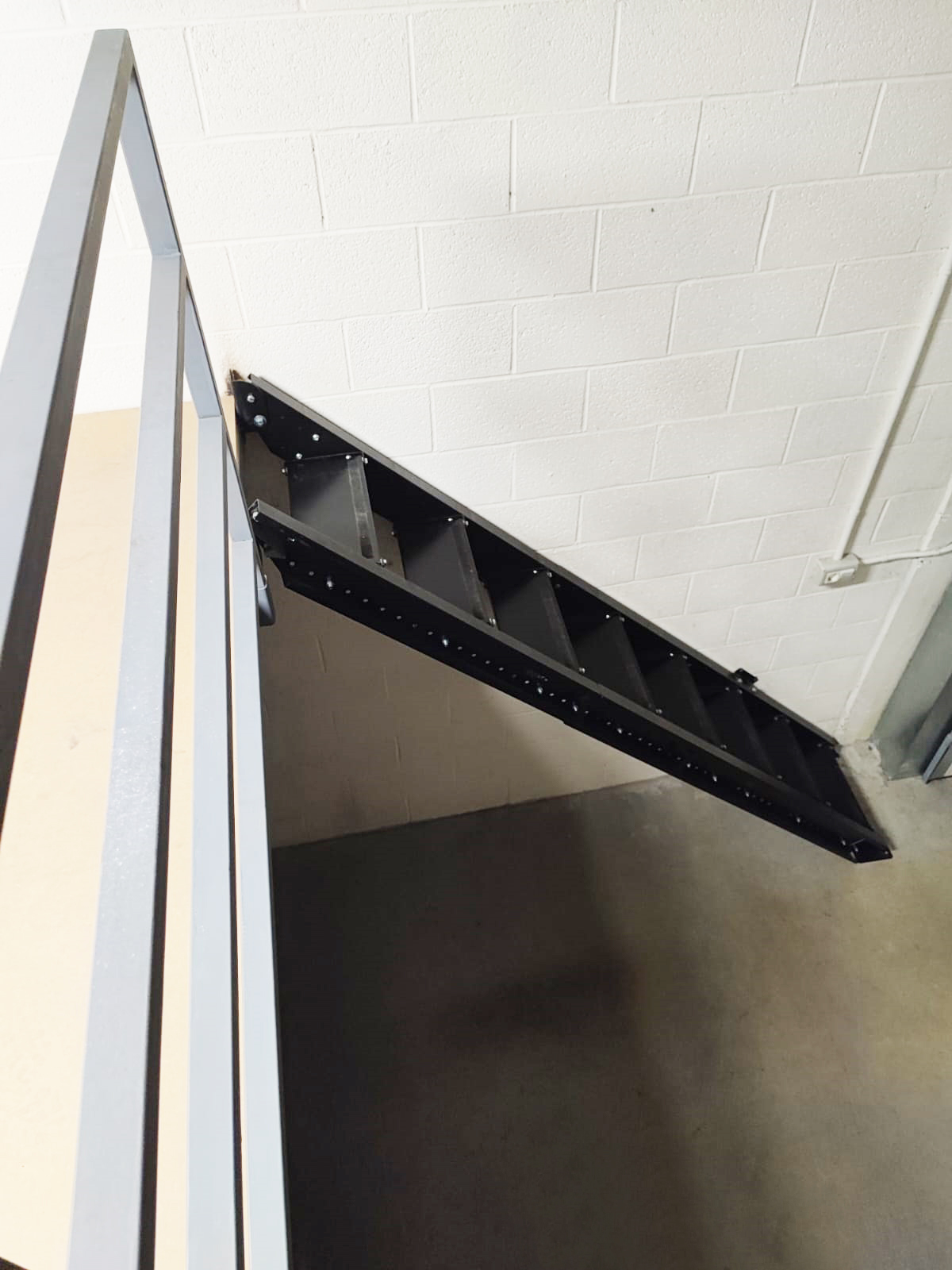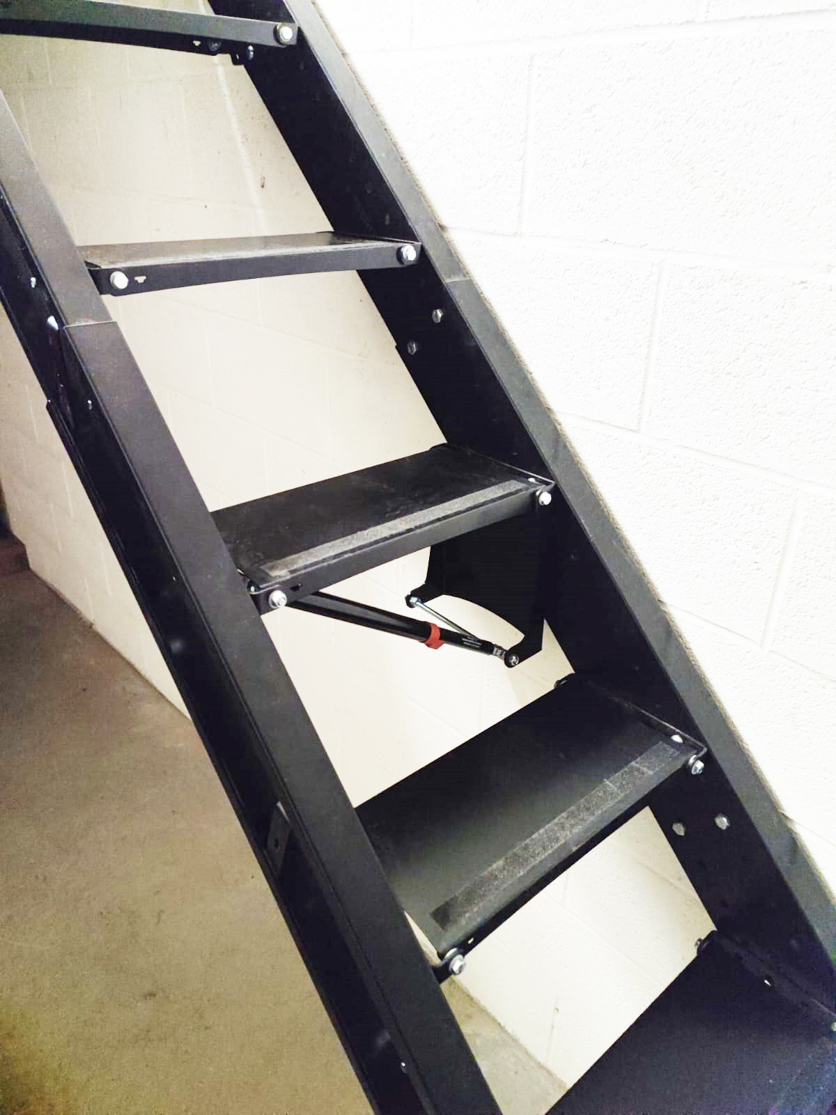 Proyecto de diseño, fabricación y montaje de escalera articulada abatible a pared para acceso a entreplanta de garaje. La escalera se manipula muy fácilmente gracias a unos pistones que lleva incorporados. Sin hacer apenas esfuerzo la escalera se abre y repliega con mucha facilidad.
