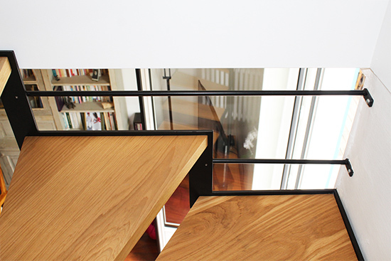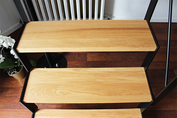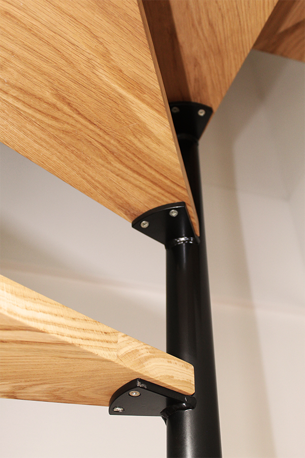 Unas pequeñas ménsulas soldadas al tubo central generan soportes para poder sujetar los peldaños de madera.