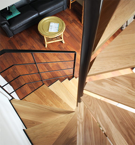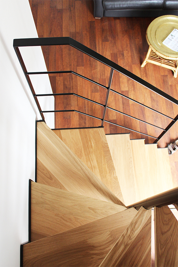 El último peldaño antes de llegar a la planta superior se ha diseñado con forma curva para aprovechar al máximo la superficie útil de paso.