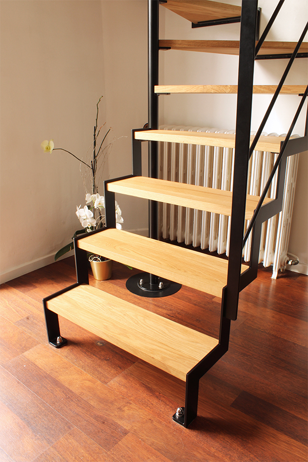 Te presentamos la escalera modelo "Anglet". Un proyecto totalmente a medida para instalar esta escalera en un espacio muy reducido de vivienda ubicada en Anglet, muy cerca de Bayona. Estructura metálica de acero al carbono termolacada en color negro RAL 9005 y peldaños de madera de roble.
