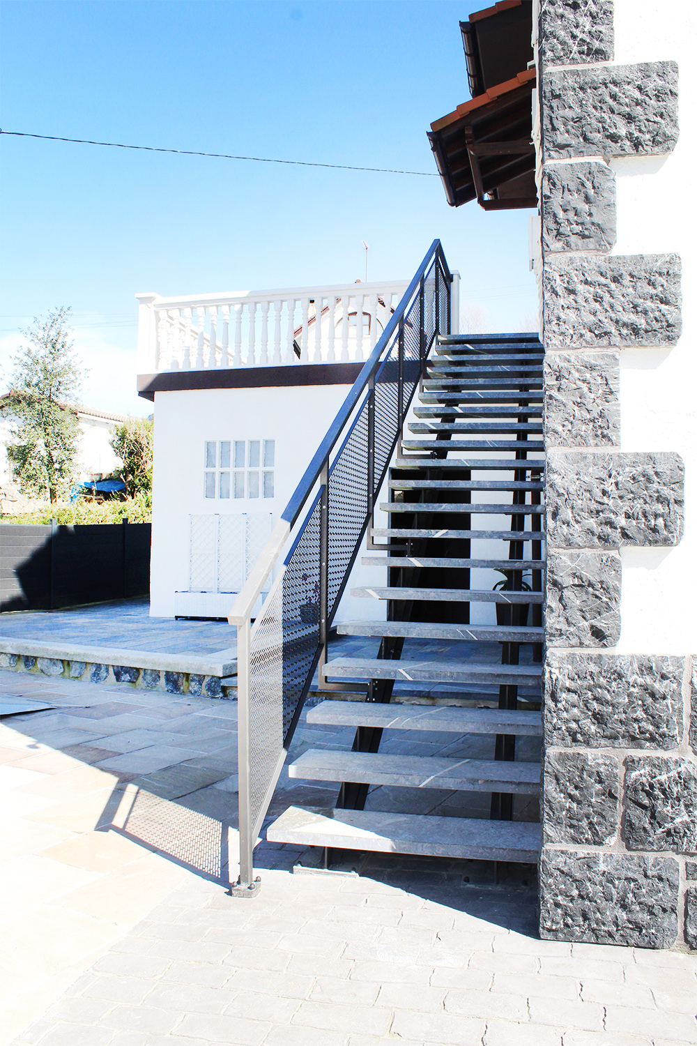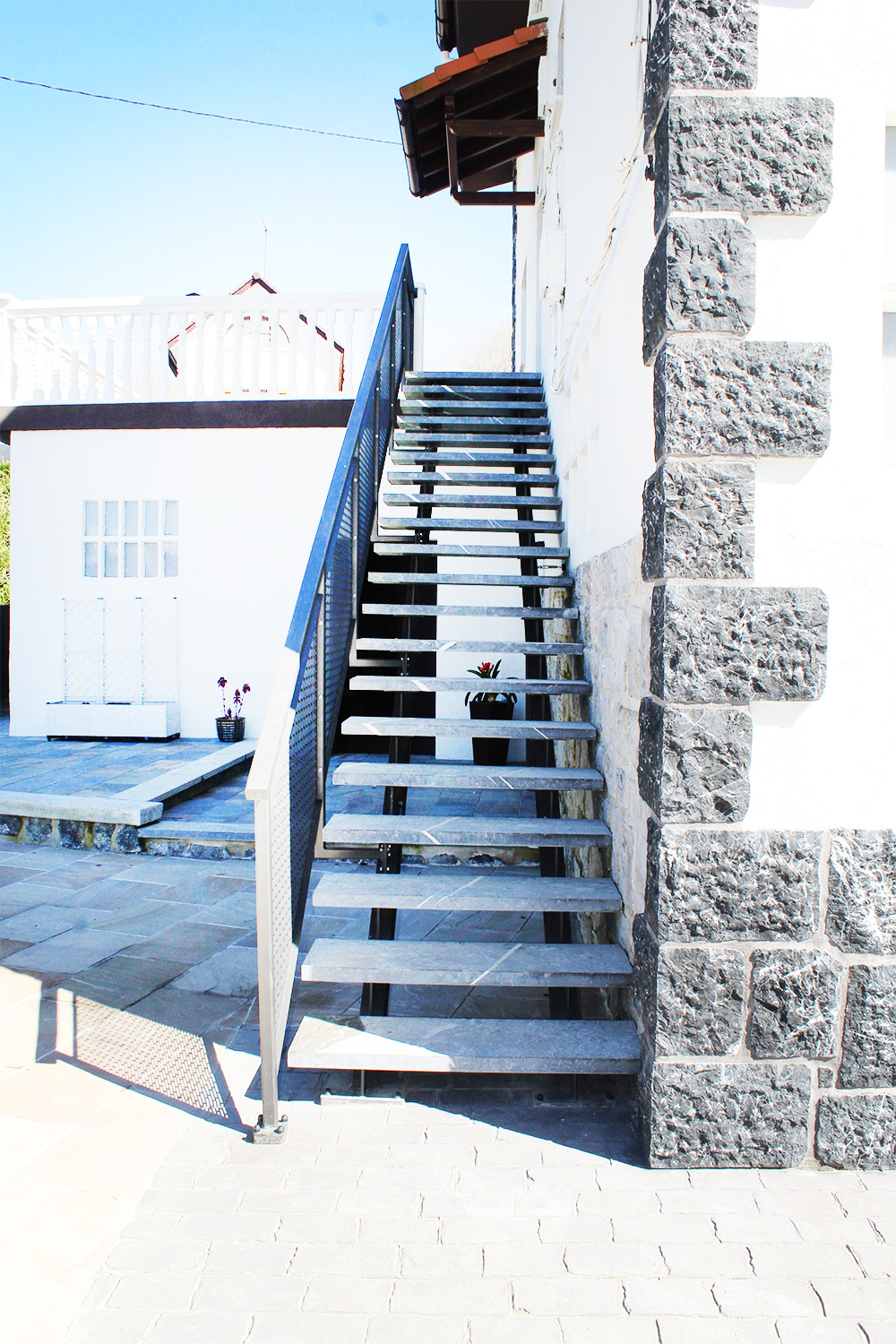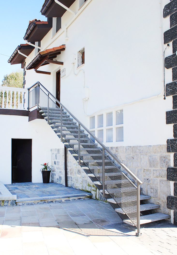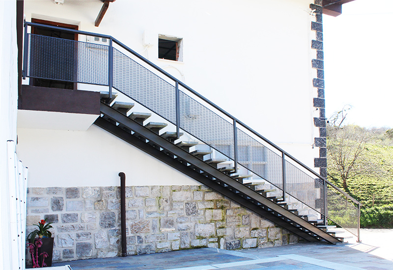 Escalera modelo «Astigarraga»: para uso en exteriores con barandilla de chapa perforada y peldaños cerámicos.