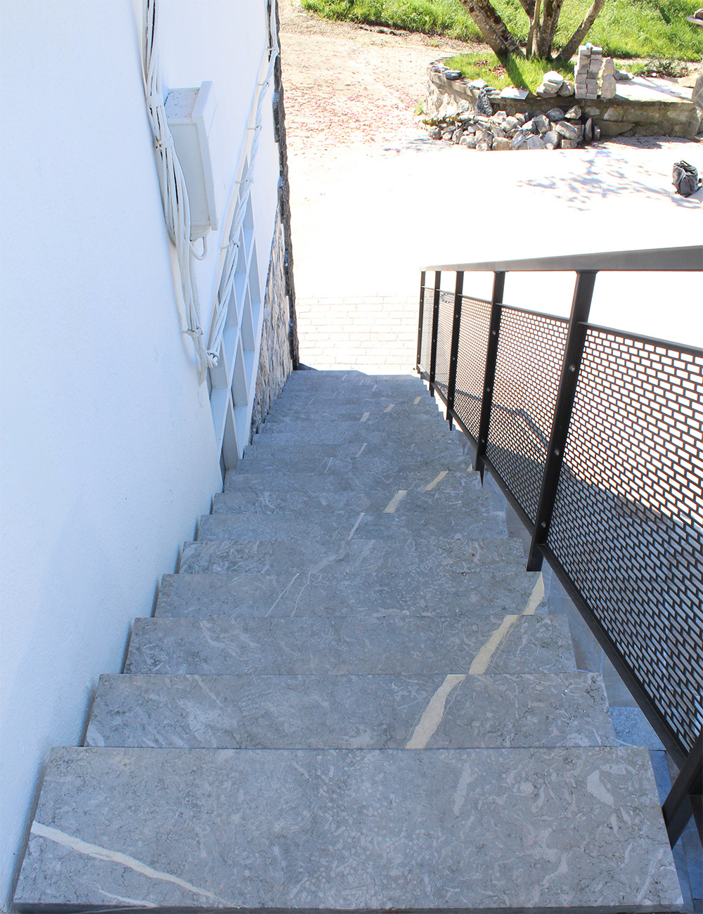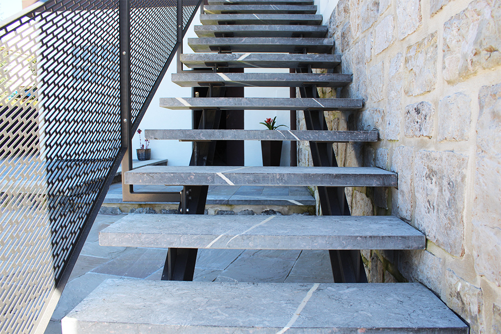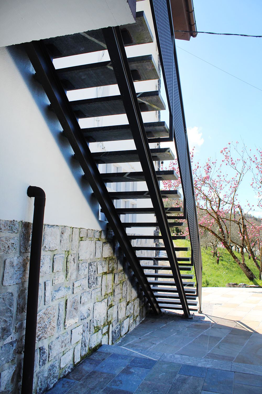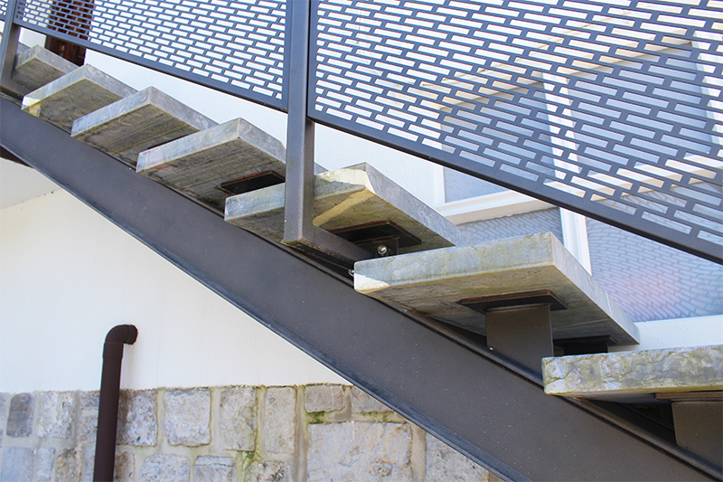 Escalera modelo «Astigarraga»: para uso en exteriores con barandilla de chapa perforada y peldaños cerámicos.