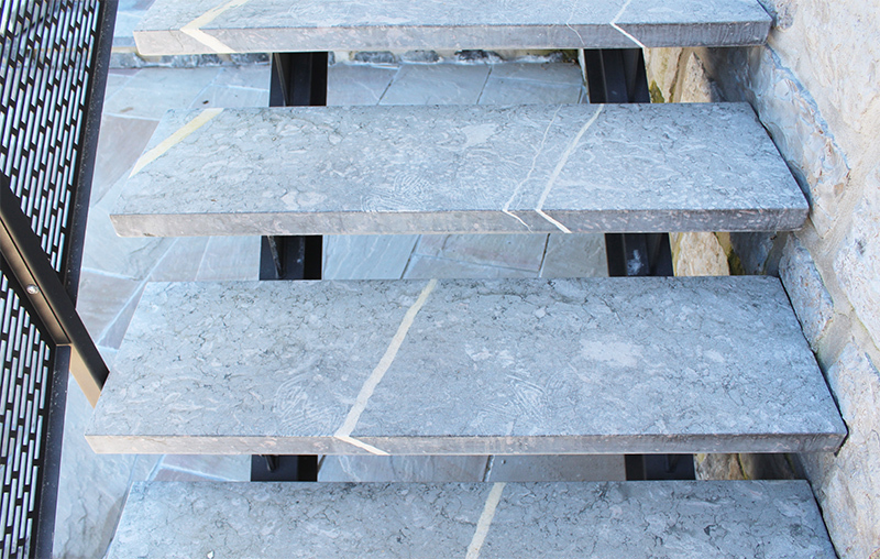 Es una escalera diseñada con materiales preparados para durar en exteriores, como el acero termolacado o la cerámica de los peldaños.