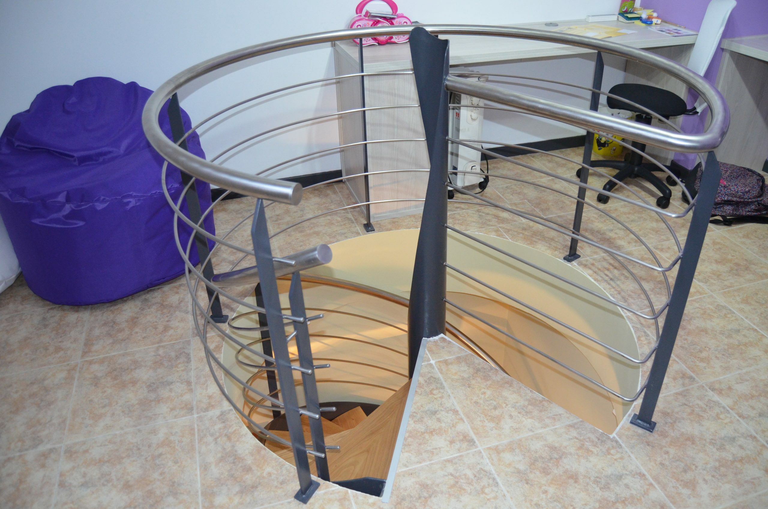 La barandilla está formada por postes verticales de acero, con pasamanos tubular y cuatro varillas intermedias. Estos materiales también han sido curvados para seguir el trazado helicoidal de la escalera.