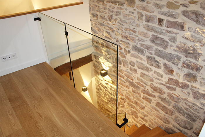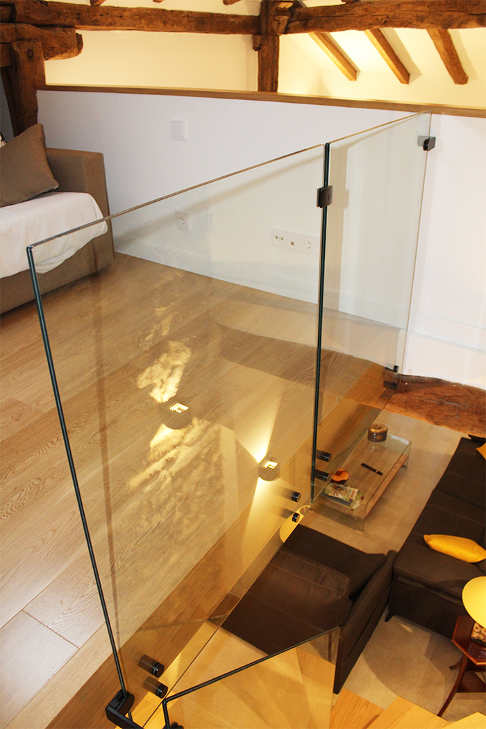 La escalera modelo "Bidasoa" incorpora barandilla de seguridad en el lado derecho, sentido ascendente. Es de vidrio incoloro, con la característica de que está instalada con anclaje lateral para aprovechar al máximo el ancho de paso de la escalera.