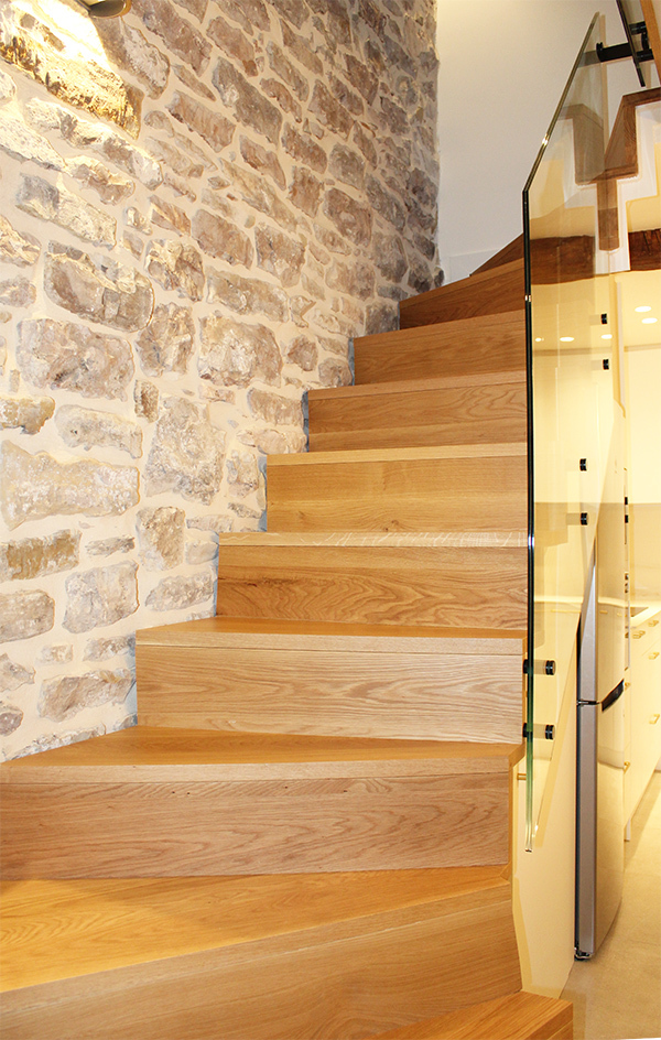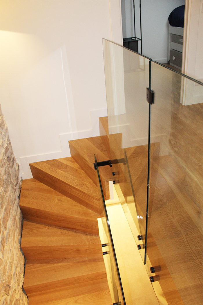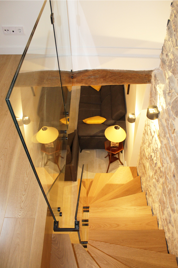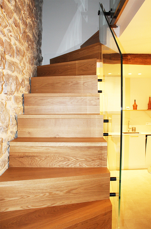 Escalera modelo «Bidasoa»: chapa plegada forrada con peldaños de madera y barandilla de vidrio.