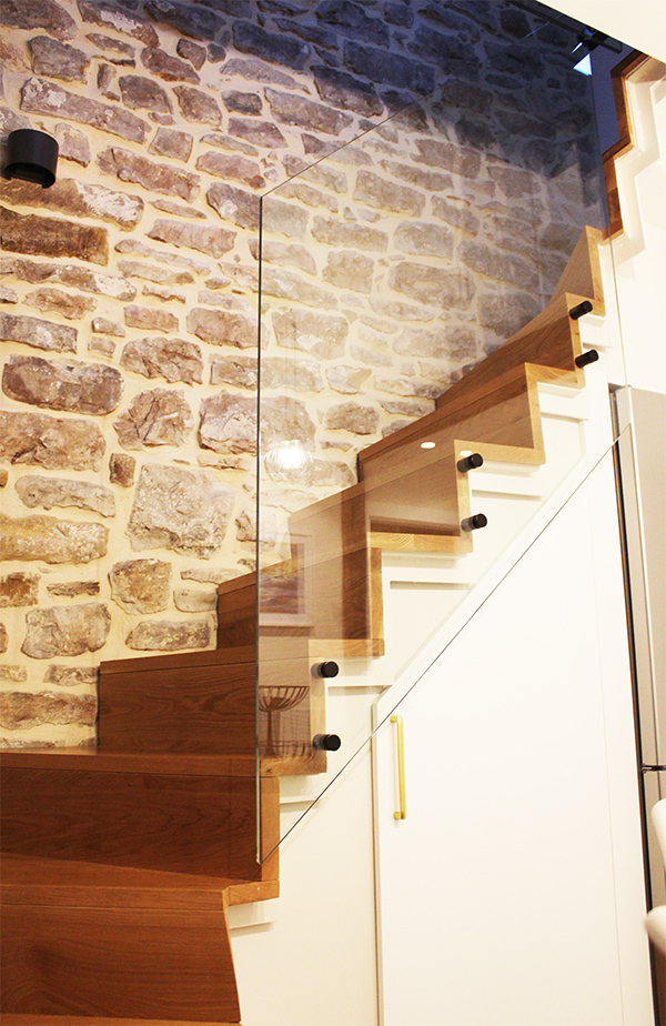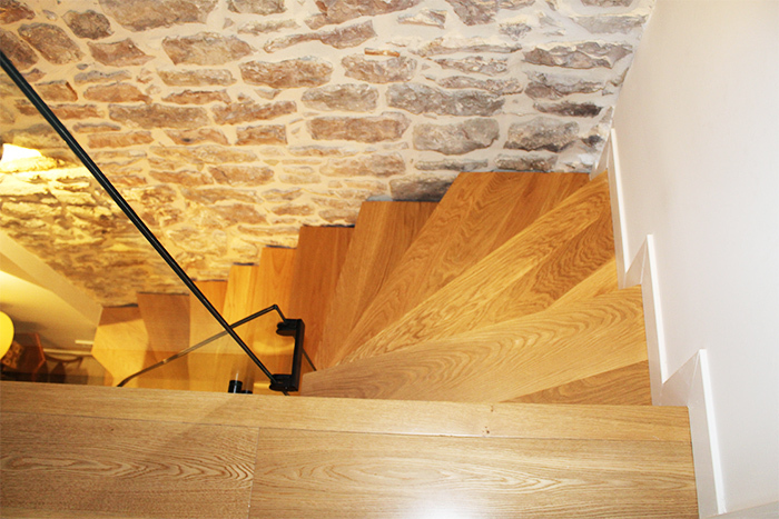 Se trata de una escalera de chapa plegada de acero al carbono, forrada posteriormente con peldaños de madera para que la estructura metálica quede oculta. Un armario diseñado a medida, ubicado bajo la escalera, ayuda a ocultar la estructura de metal que sostiene y da rigidez a la escalera.