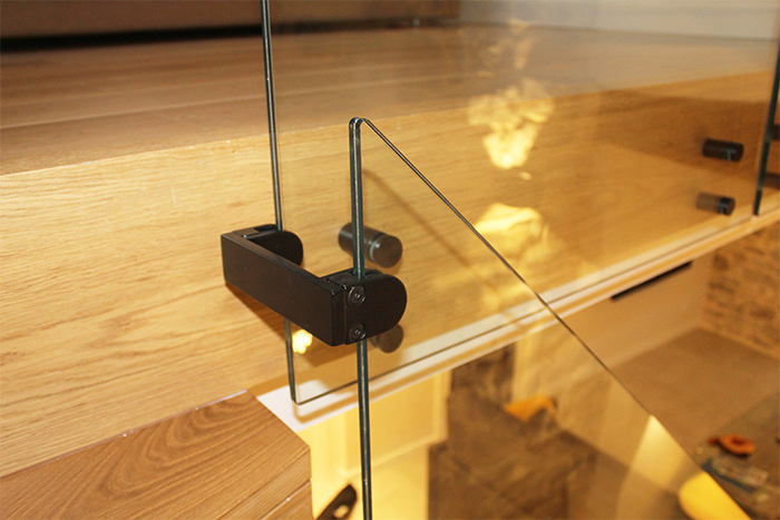 Nos gustar cuidar los detalles en cada uno de los proyectos de escalera que realizamos. Como esta unión entre las barandillas de tramo de escalera y tramo recto. La pinza dota de estabilidad al vidrio sin necesidad de otro anclaje más invasivo.