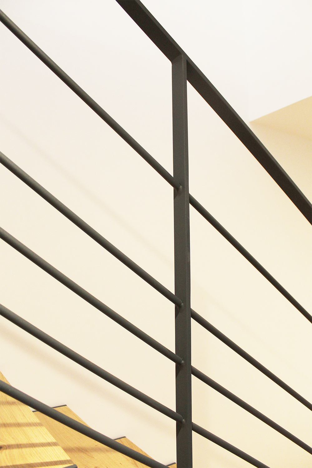 La barandilla es de acero al carbono con termolacado en gris forja. Está formada por pasamanos y postes de pletina con cuatro barras longitudinales macizas.