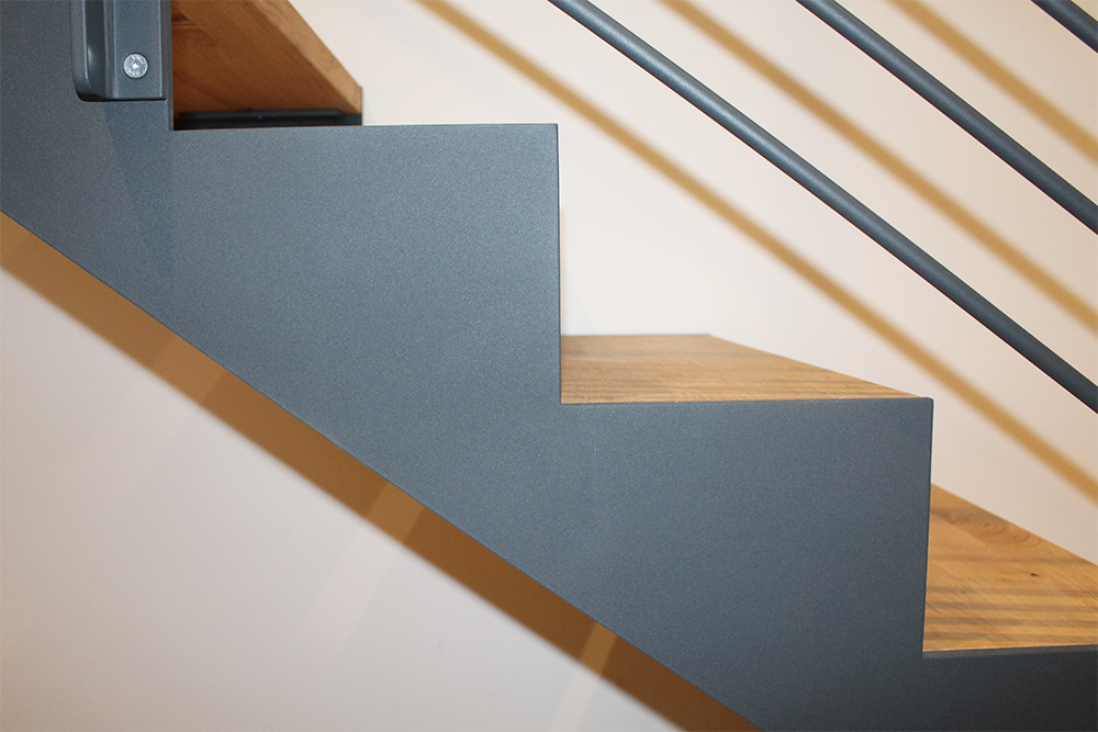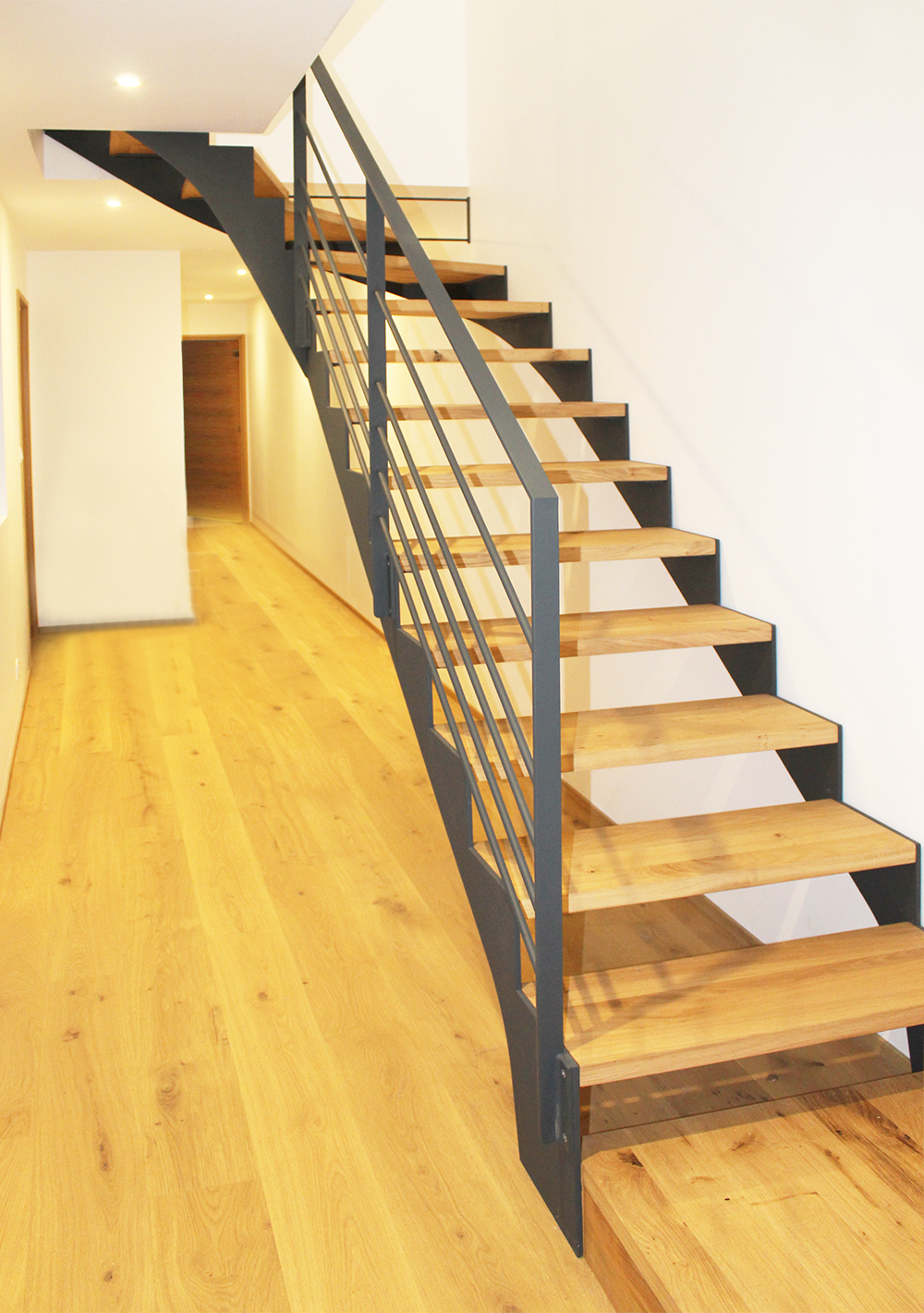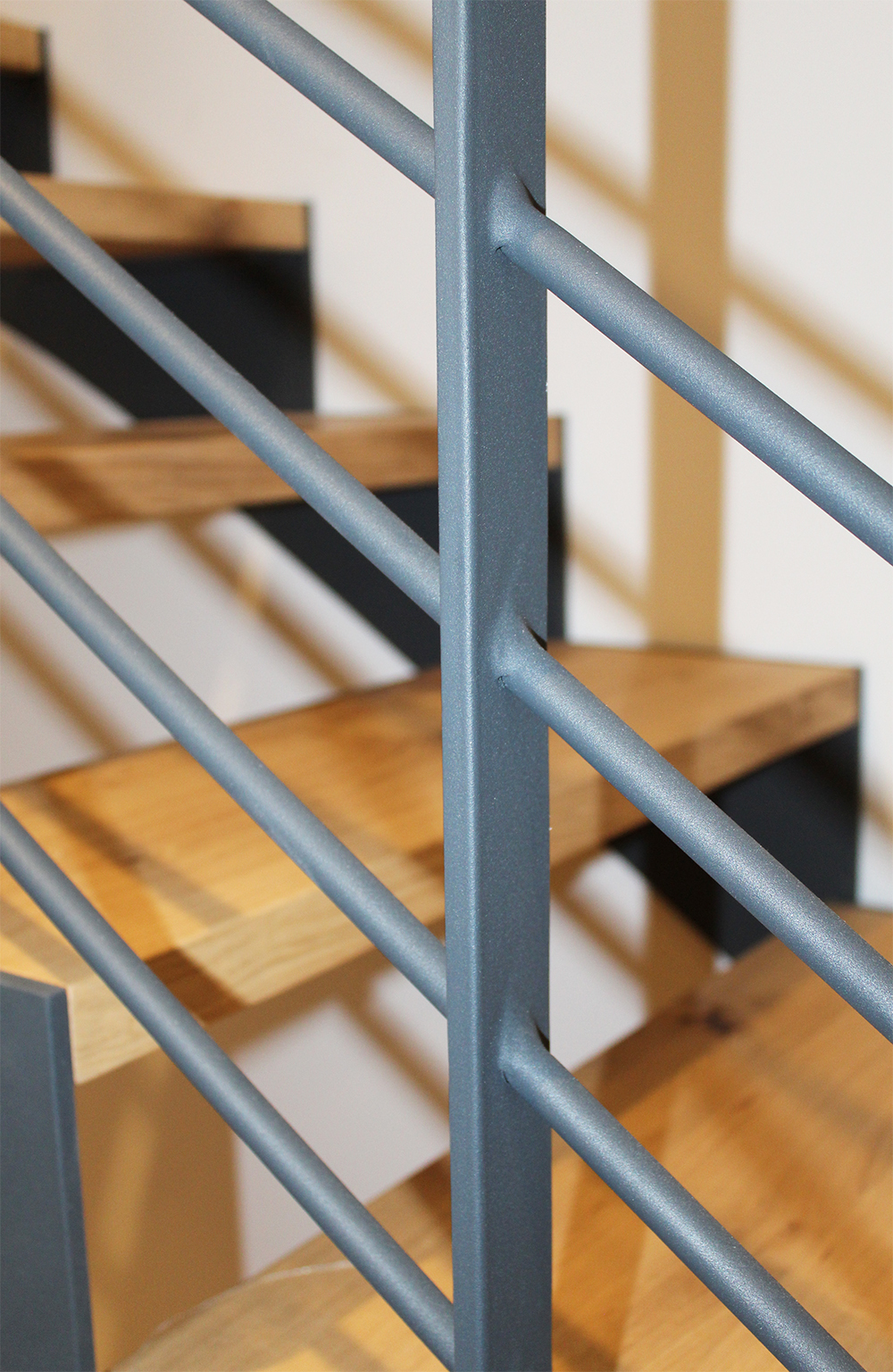 Escalera modelo «Ustaritz»: zancas laterales en diente de sierra y termolacado en gris forja.