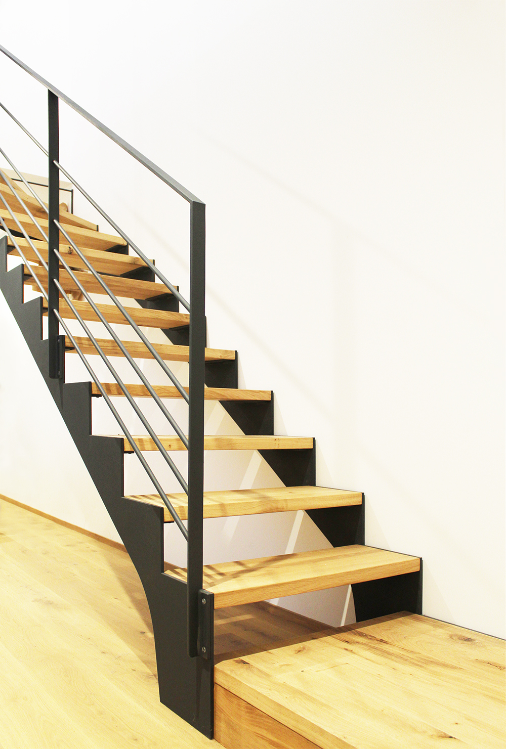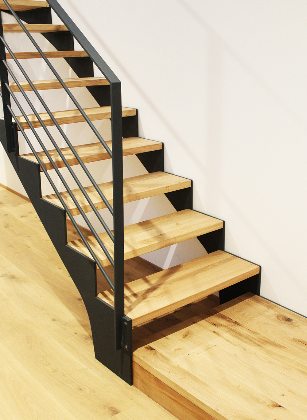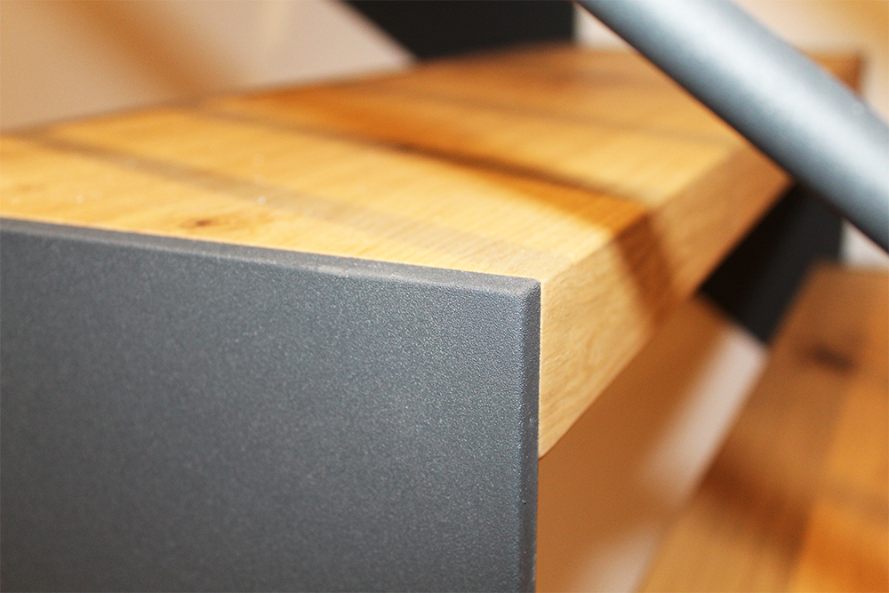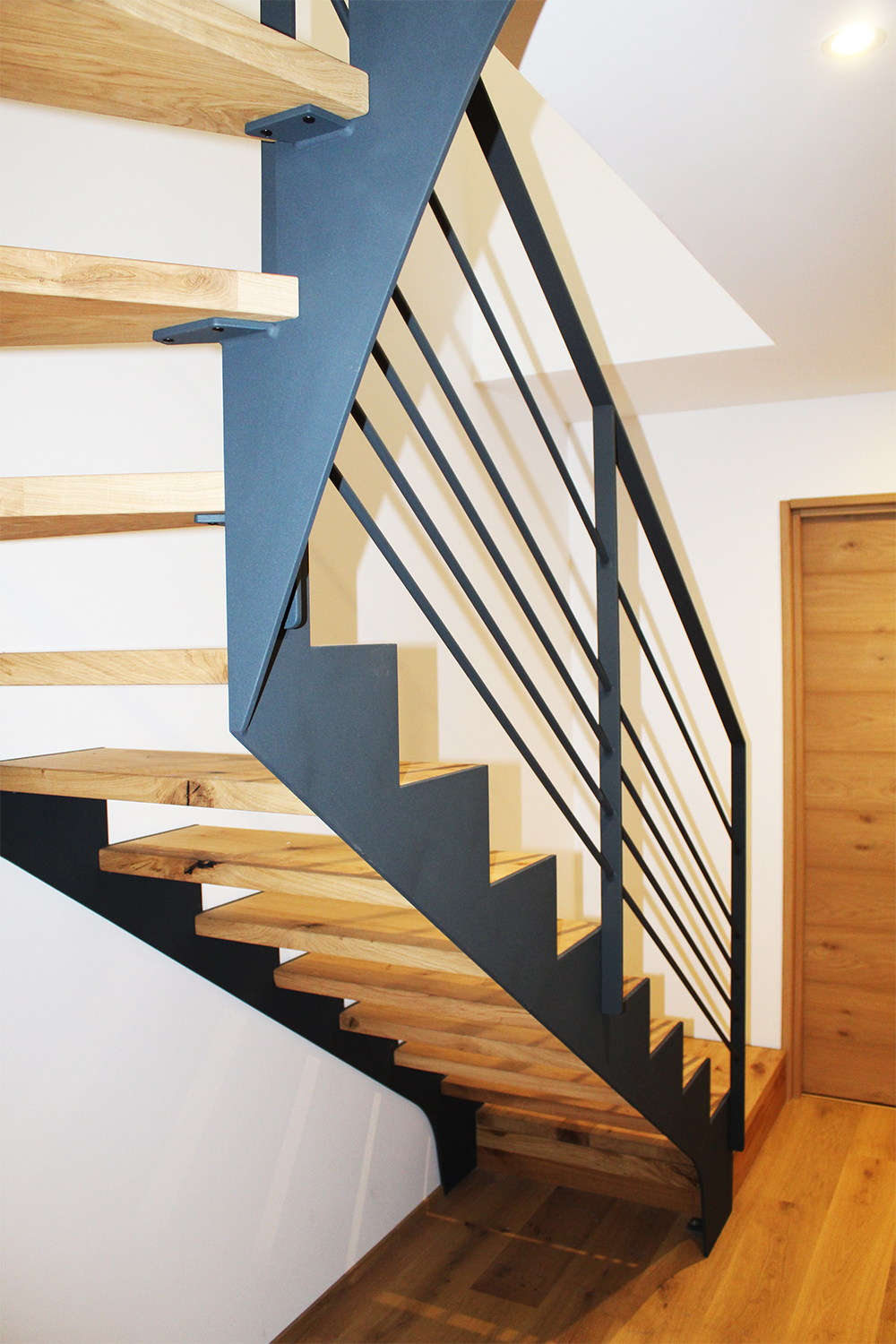 Escalera modelo «Ustaritz»: zancas laterales en diente de sierra y termolacado en gris forja.
