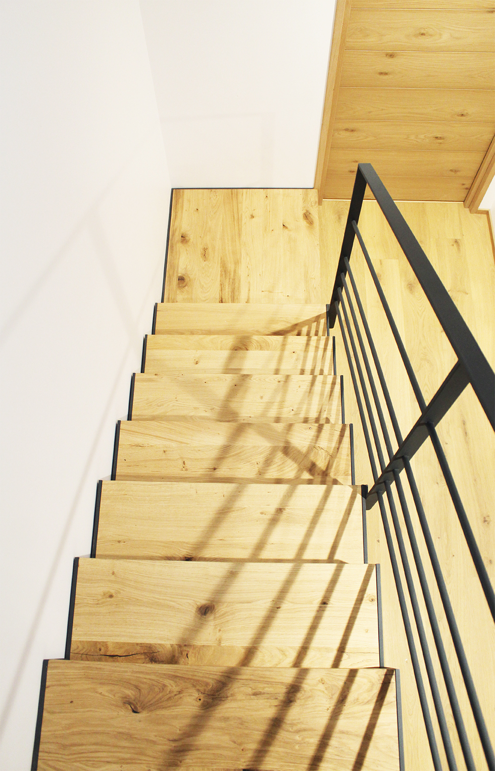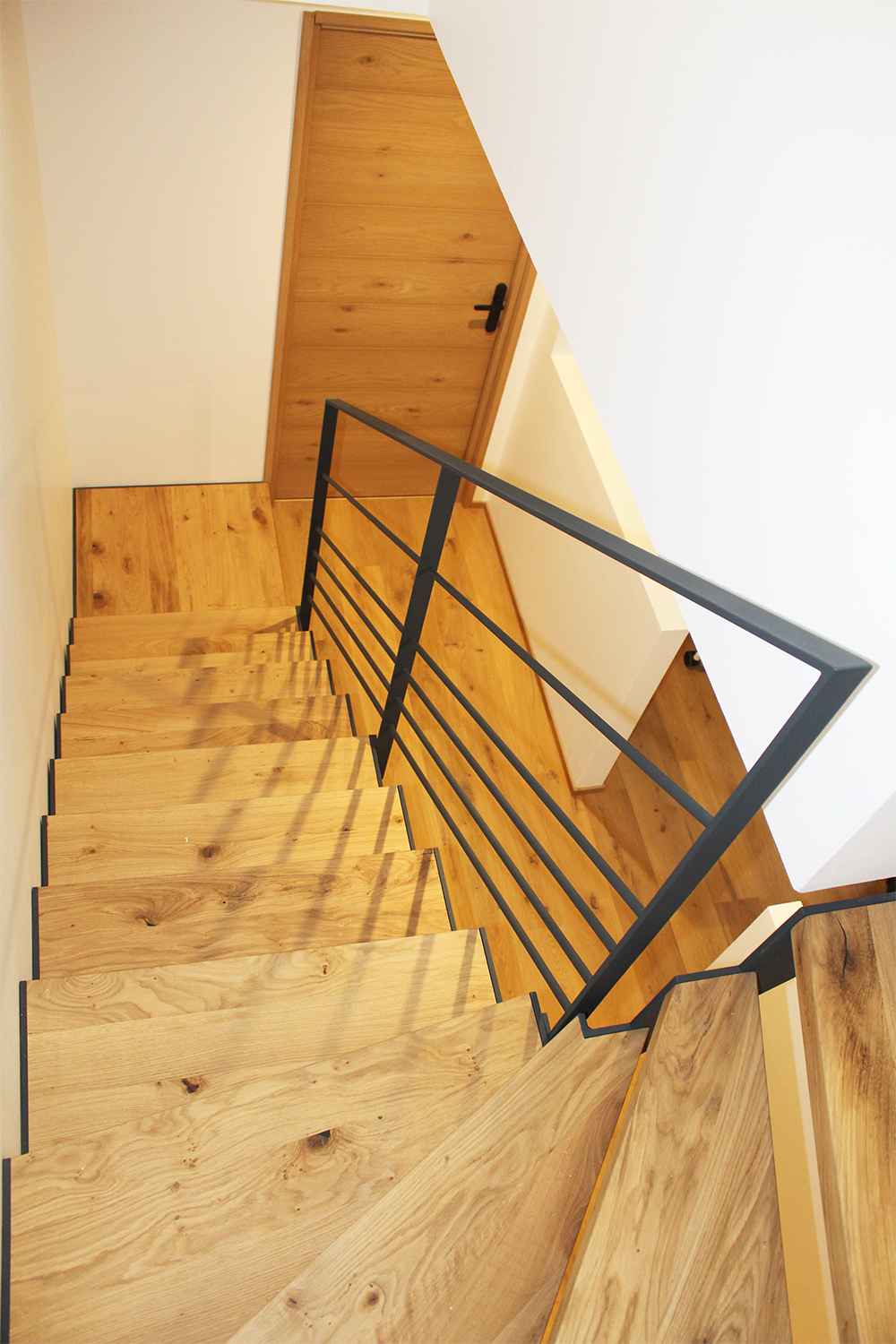 Las huellas de la escalera son de madera de roble rústico barnizado mate efecto nature. También la cajonera de madera que sirve como primer peldaño en la planta baja.