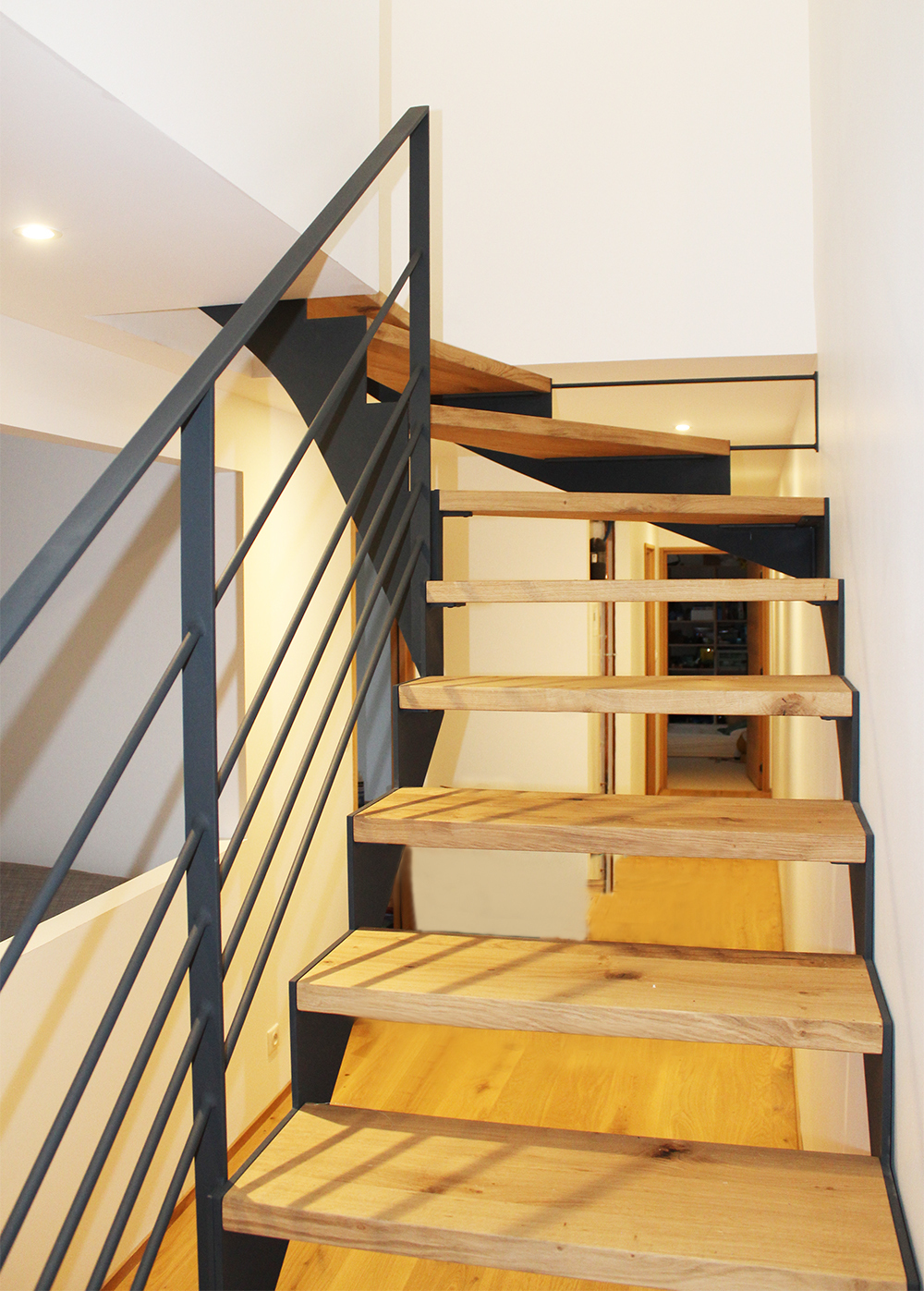 La estructura principal de la escalera es de acero, dotando de una gran resistencia y estabilidad a la escalera. La fabricación se realiza en nuestro taller de Hernani y no realizamos ninguna soldadura en la vivienda.