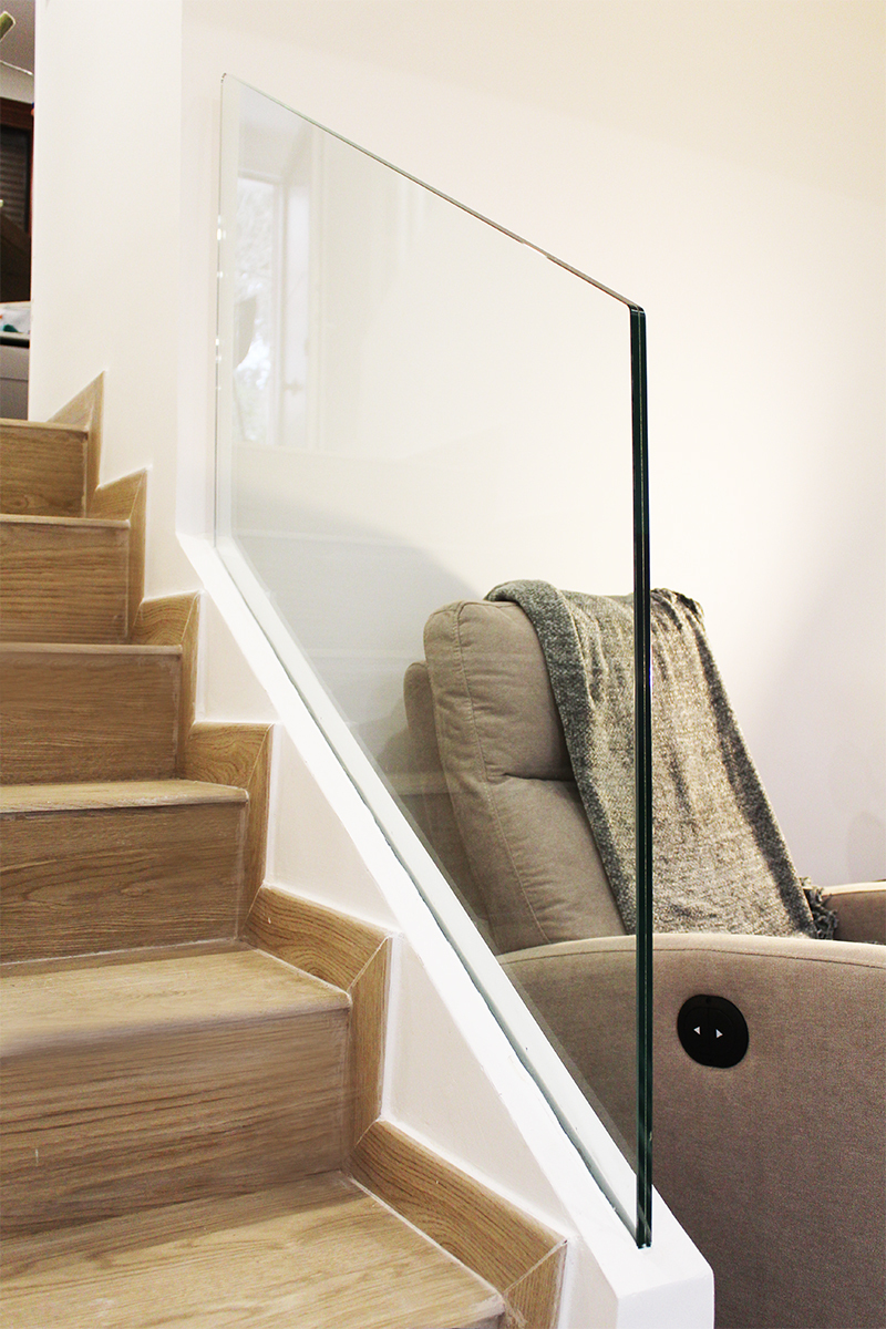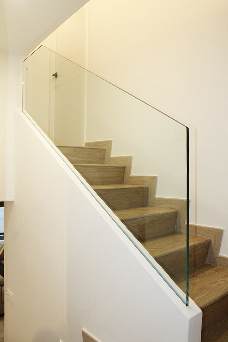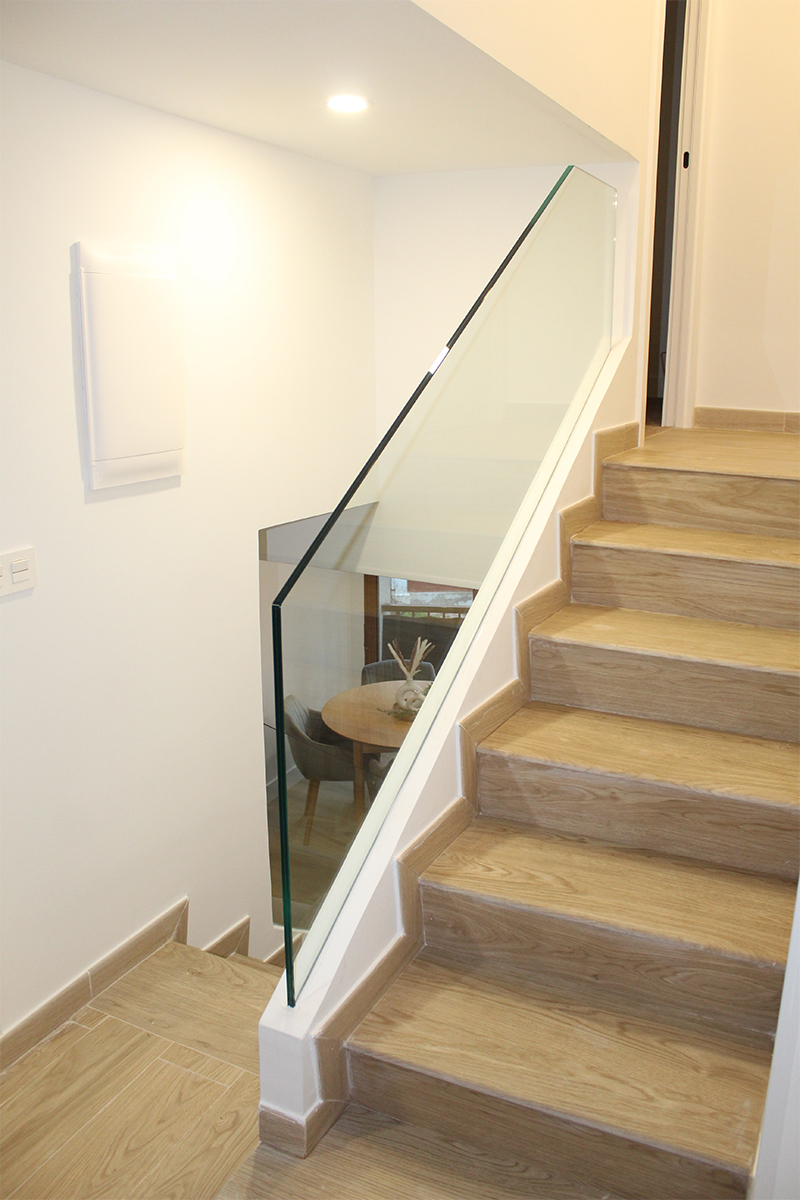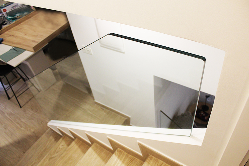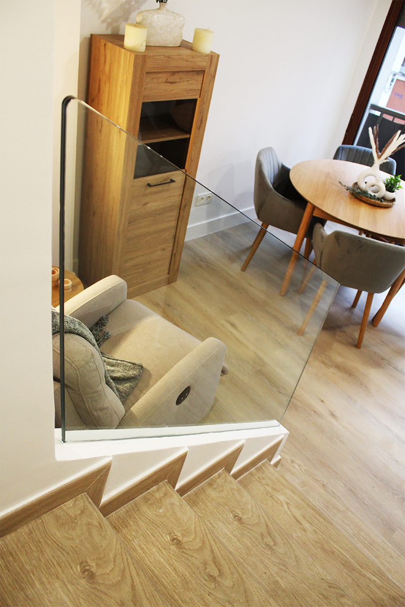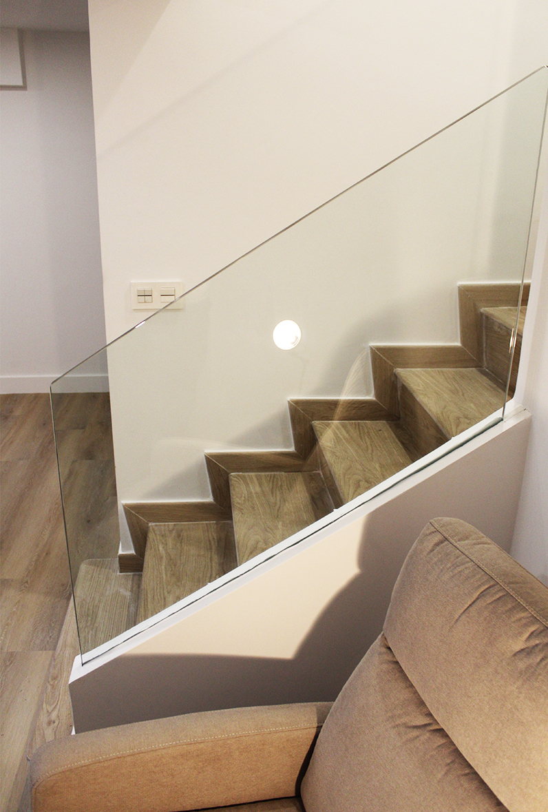 Proyecto de diseño, fabricación y montaje de dos tramos de barandilla de vidrio de 8+8 en vivienda recién reformada en Trintxerpe. Ambos vidrios son para tramos de escalera.