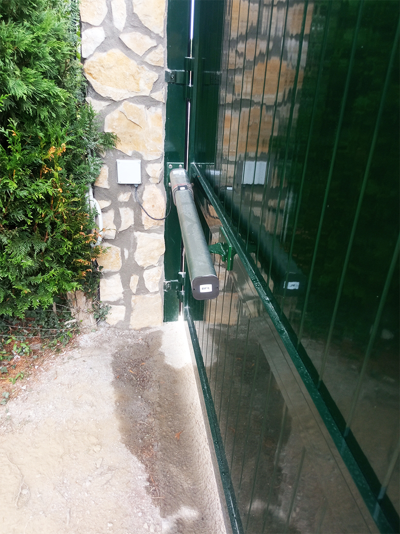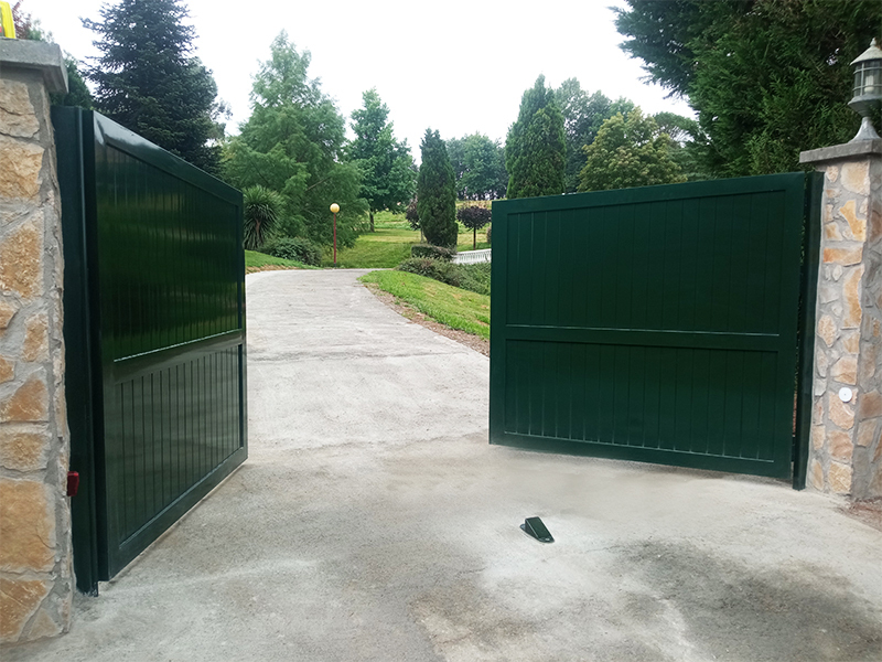 Puerta de aluminio soldado de dos hojas con motorización.