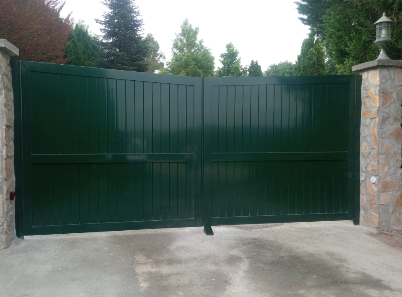 Proyecto de fabricación y montaje de puerta exterior de doble hoja en aluminio soldado y termolacada en color verde RAL 6009. Trabajo realizado para cliente de Lasarte.