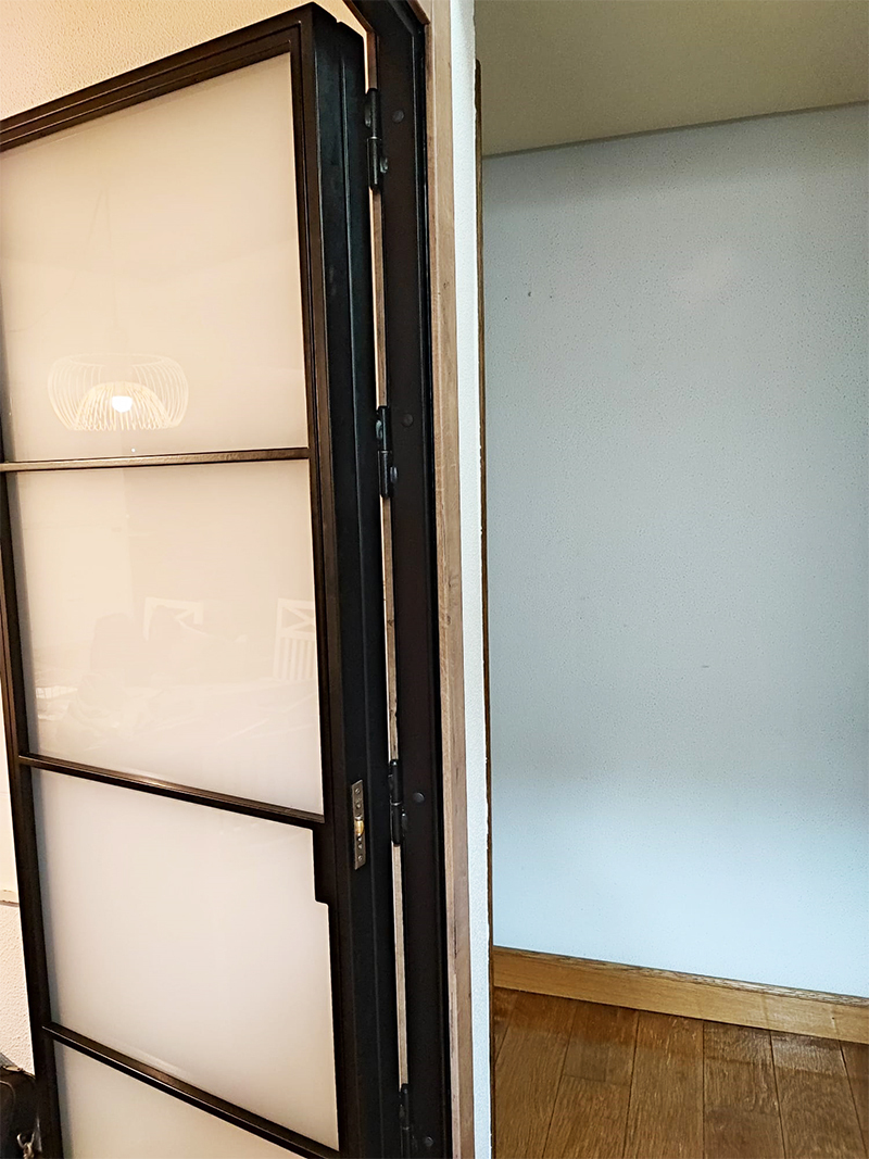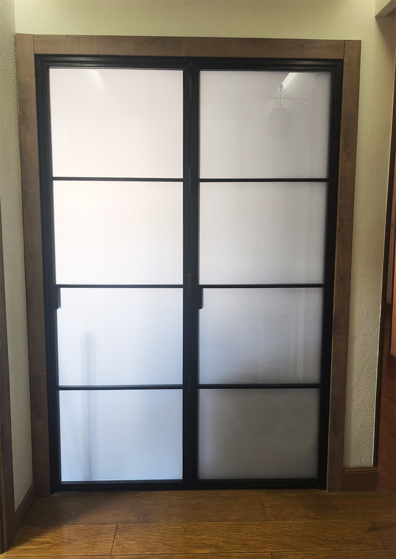 La perfilería de la puerta es de acero al carbono y está termolacada al horno en color negro RAL 9005 mate. El vidrio es traslúcido para facilitar una ligera iluminación de la estancia, manteniendo al mismo tiempo la privacidad ya que no se aprecia lo que hay al otro lado.