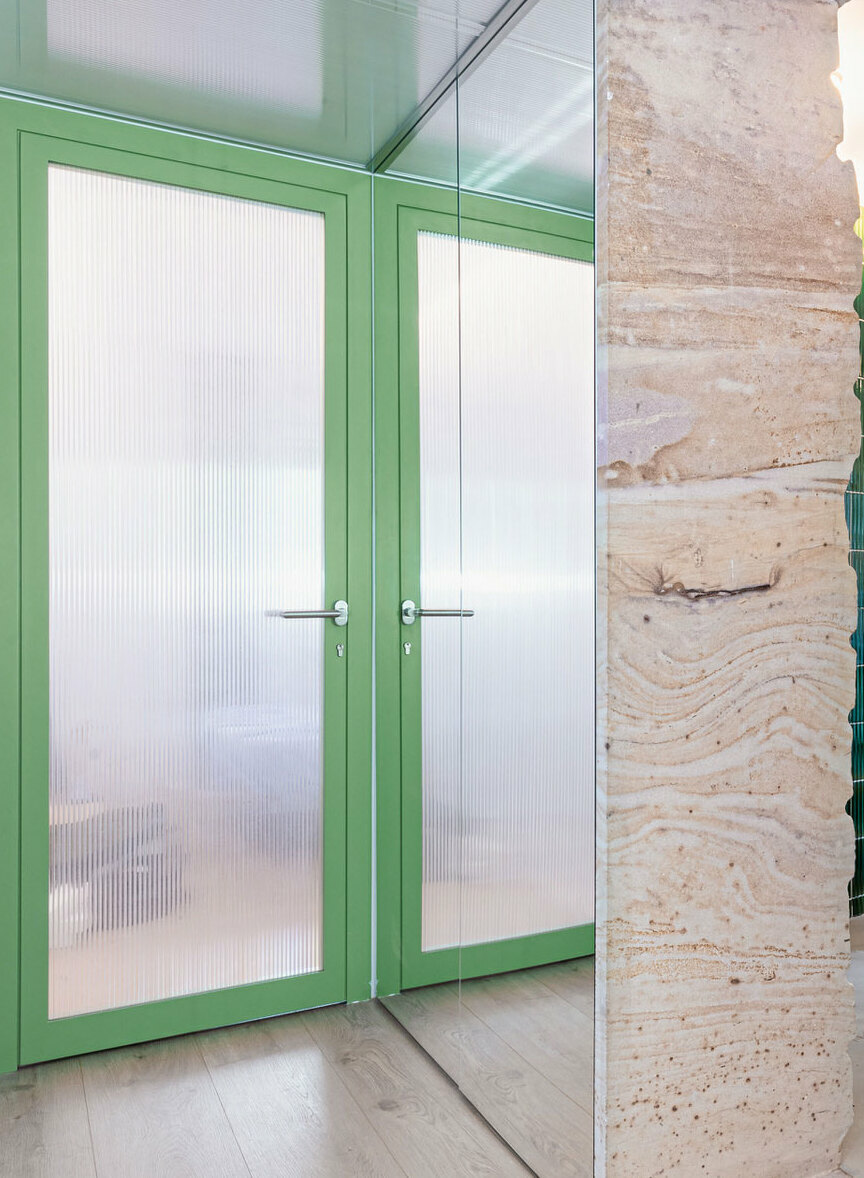 La puerta está termolacada en color verde, siguiendo el mismo estilo de otros elementos de la reforma.